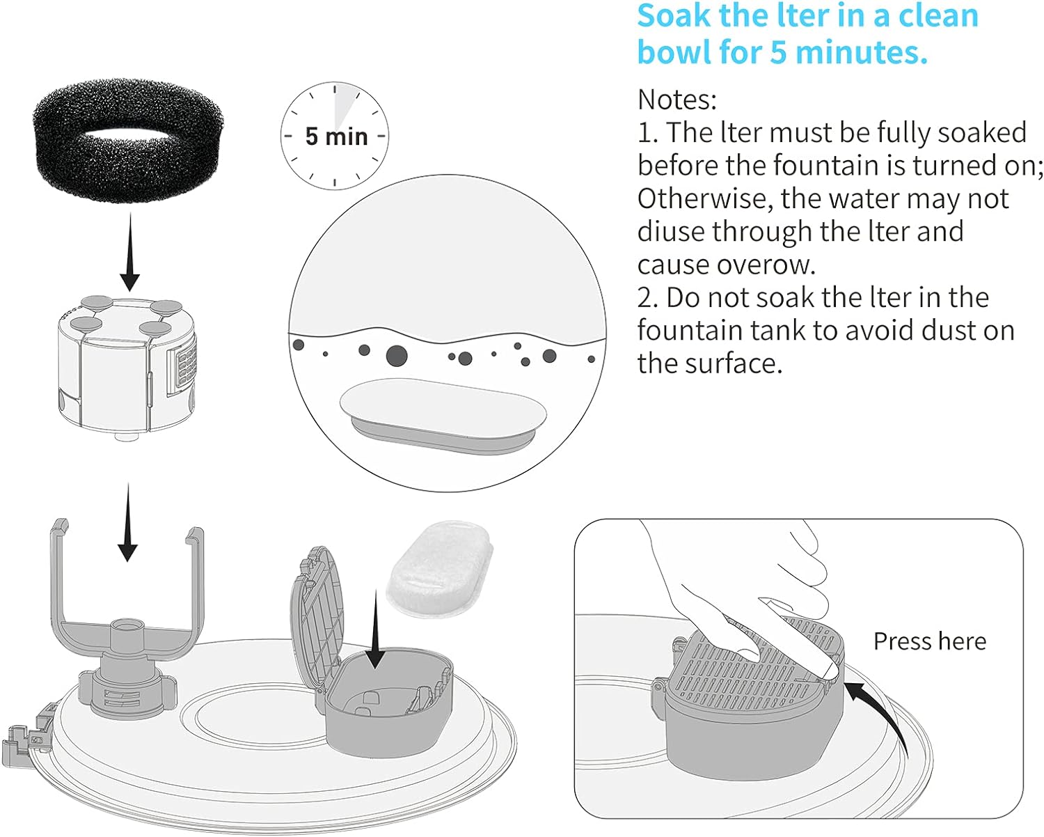 - 【Matters needing attention】Soak the lter in a clean bowl for 5 minutes Notes, The lter must be fully soaked before the fountain is turned on; Otherwise, the water may not flow through the lter and cause overow, Do not soak the lter in the fountain tank to avoid dust on the surface.