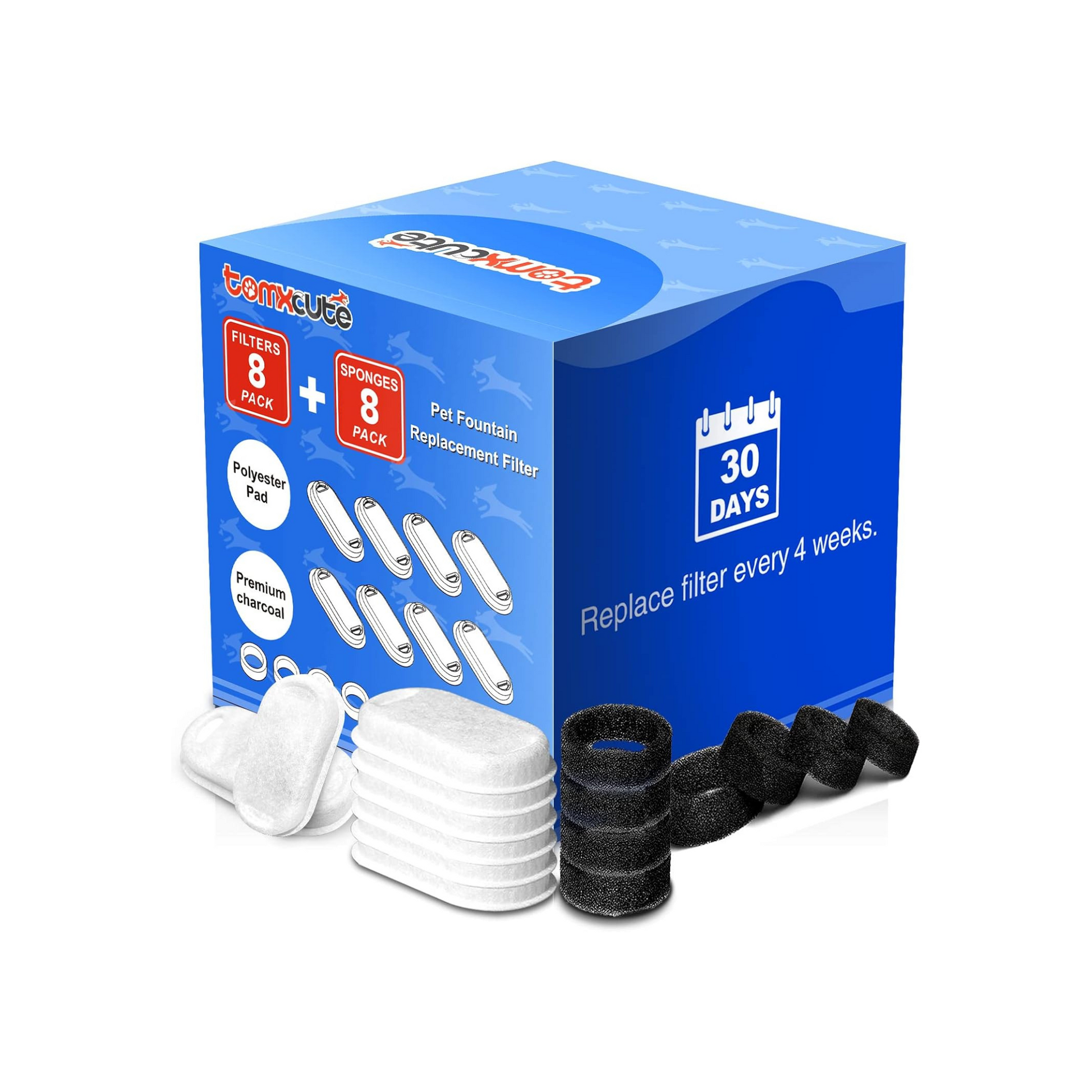Tomxcute 8 Packs Filters & 8 Sponges Foam Filters for 108oz/3.2L and 135oz/4.0L Adjustable Water Flow Pet Water Fountain